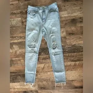 Super skinny, distressed, cut off/raw edge hem. Light wash.
