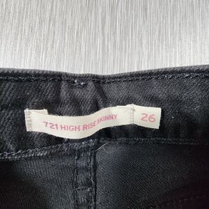 The Levi's 721 High Rise Skinny Jeans are a women's denim product with a black, distressed, dark wash. They feature a 5-pocket design, a zip and button closure, and a high rise waist of 26 inches. The jeans have a slim fit and a 30-inch inseam. The accents include a logo, a zipper, and buttons. The style is skinny and the features include distressing. The jeans are part of the Levi's 700 Series product line and are suitable for winter, summer, and spring.