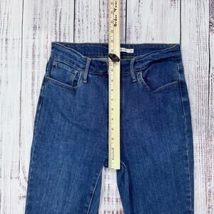Levi’s 721 high-rise skinnies in a medium blue wash. Stretch denim, raw-cut ankle hem, five pockets, zip fly. Women’s 28.