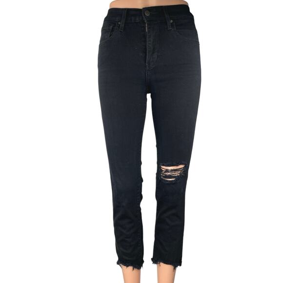 Levi's 724 High Rise Straight Crop Distressed Raw Hem Black Denim Jeans Size 25