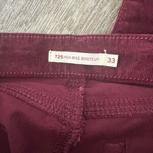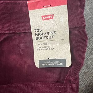 This listing is for a NWT's Levi's 725 high-rise bootcut corduroy jeans in Windsor Wine in size 33 x 32. These corduroys are designed to flatter, hold, and lift.