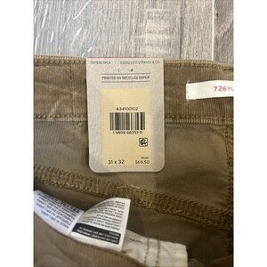 The Levi's 726 Flare Corduroy Jeans Pants in size 29X32, 31X32 or 30X32 are a stylish women's option for mid-rise denim with a flared leg. Made from a blend of cotton and elastane, these brown pants feature a corduroy fabric that is both comfortable and slimming. With a zip and button closure, these versatile jeans can be worn for casual outings, workwear, or even a party, making them a wardrobe staple for any season. The flared style adds a trendy touch to the classic design, while the stretch material ensures a comfortable fit.