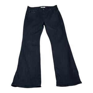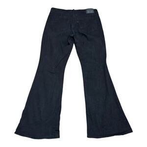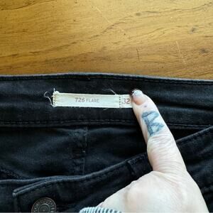 Levi’s 726 High Rise Flare Jeans In Soft Black in a size 32. Has five pockets and five belt loops. Front zipper and button closure. 78% cotton, 21% polyester, 1% elastane. Measures approximately 16” flat lay waist, 11” rise, 30” inseam. In great condition.