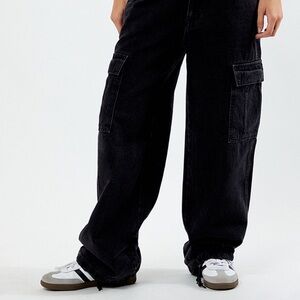 The Black '94 Baggy Cargo Jeans from Levi's are a perfect throwback to '90s fashion. With their slouchy fit, mid-rise, and straight leg openings, these jeans feature a baggy fit, cargo side pockets, and drawcord ankle cuffs, offering a stylishly relaxed and functional look.