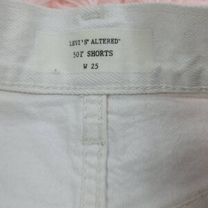 Levis Altered 501 Shorts White Button Fly Fringe Hem Women's 25 In Great Condition Approximate Measurements (Flat) Waist 14" Inseam 2.5" Rise 10" Bin 5079