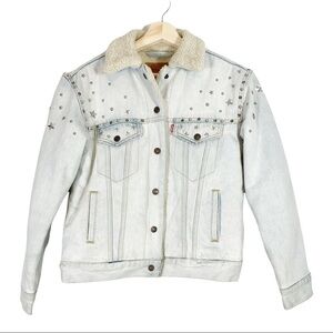 Pre-owned Levi's Big E Ex-Boyfriend Trucker Star Studded Denim Jacket Size XS. Features: quality denim fabric with warm sherpa lining. Round and star shaped studs. Button up front and cuffs.