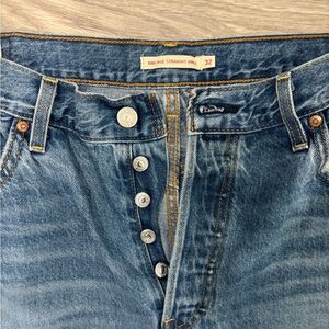 Stylish distressed blue jeans with button fly. Perfect for casual