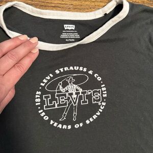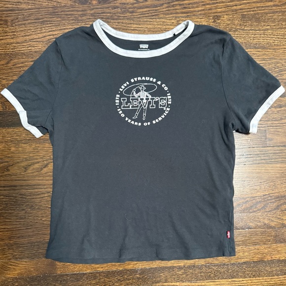 Classic Levi's short-sleeve ringer tee. Black body with white contrast collar and sleeve trim. Centered Levi's logo graphic. Casual, everyday silhouette.
