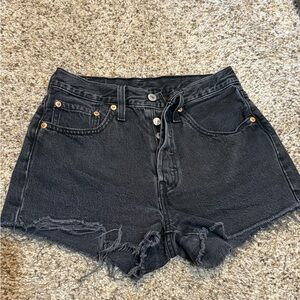 Levi's charcoal denim shorts with raw hem. Features classic back pocket design. Size 26