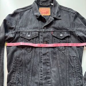 Levi's black denim jacket in size small. Little bit of stretch. Some wear in underarm area.