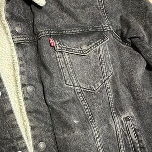 Classic Levi's denim jacket. Black exterior with white sherpa lining. Button-up front. Two chest pockets.