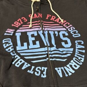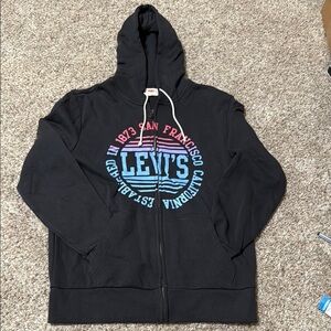 Levi's black hoodie featuring a colorful graphic logo. Comfortable and stylish.