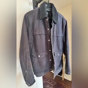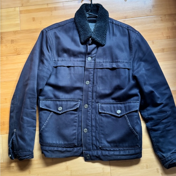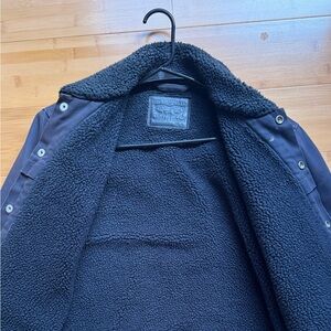 Classic Levi's field jacket with sherpa lining. Features button closure and flap pockets. Ideal for cool weather.