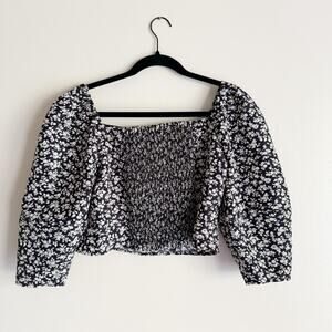 Levi's Black + White Floral Print Statement Shirred Back Blouse - Large