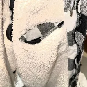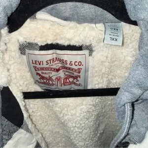 Warm and durable flannel jacket by Levi with a black, white, and gray plaid pattern. Sherpa lined body for added warmth with a soft hooded sweatshirt style lining. Button front closure with hidden zipper. With chest pockets, regular pockets, and a hidden pocket on the inside. With a relaxed fit, ideal for casual wear or layering in colder weather.