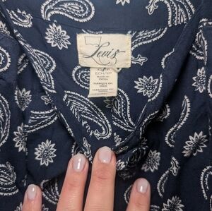 This Levi's sundress features a chic black and white design, perfect for a casual night out. The sleeveless mini dress is adorned with delicate white floral patterns that contrast beautifully against the black background. With its spaghetti straps and flared silhouette, it offers a stylish and comfortable fit for any evening occasion.