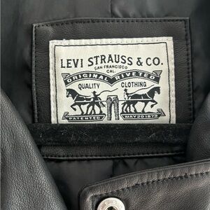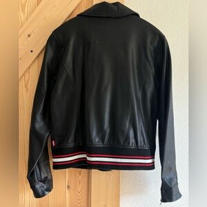 Levi's black leather jacket featuring red and white striped accents. Front zip pockets