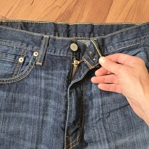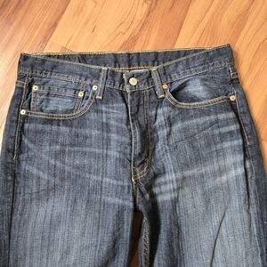 Levi Strauss & Co 100% cotton dark, cool indigo wash pull on 514 straight fit denim blue jeans with bronze stitching, 5 pocket design with belt loops, full zip fly and button closure. Copper and silver hardware. Men's 34, VGUC.