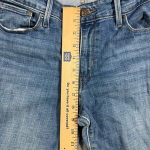 These Levi's jeans feature a classic medium blue wash with stylish distressing above the knee, offering a trendy worn look. The ankle-cropped design and rolled cuffs add a modern touch, making them perfect for casual outings.