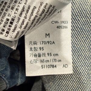 Stylish Levi's jacket. Blue denim body. Gray sleeves. Button-up front. Classic design.