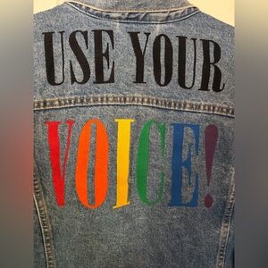 Stylish Levi's denim jacket. Features bold 'Use Your Voice' print. Multicolor lettering adds vibrant touch.