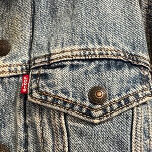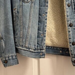 Classic Levi's denim jacket. Features cozy sherpa lining. Ideal for casual wear.