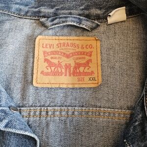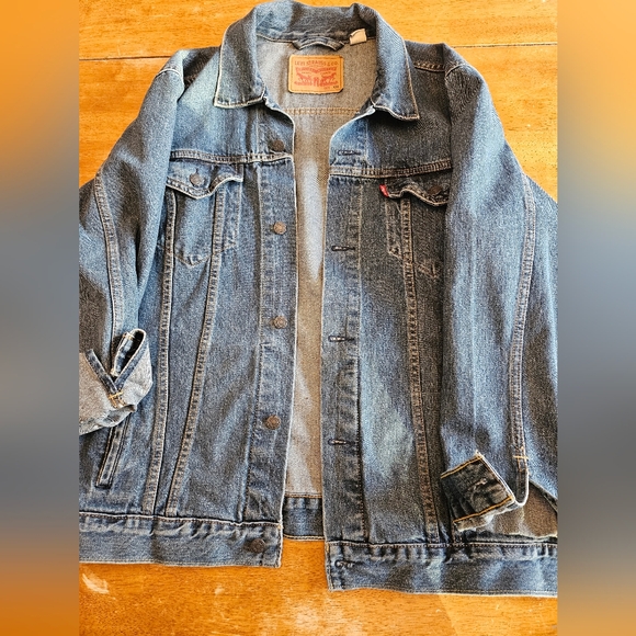 Levi's denim jacket in blue. Features a tan label with classic branding. Button closure and durable fabric.