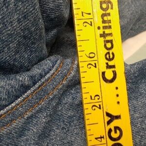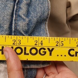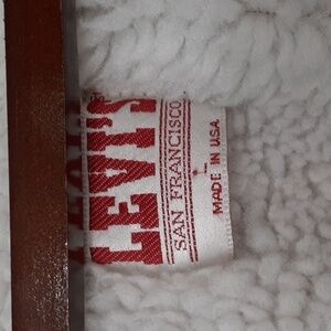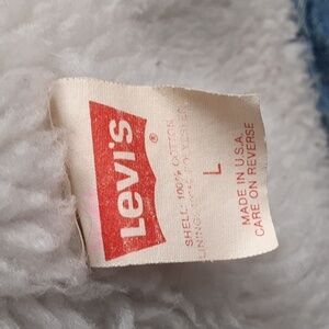 Classic Levi's denim jacket. Features cozy white sherpa lining. Button closure and chest pockets. Perfect for casual wear.