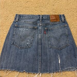 Stylish Levi's mini skirt. Classic blue denim. Frayed hem for a trendy look. Perfect for casual wear.