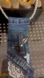 Recycled Unique blue denim patchwork featuring a colorful hummingbird pin. Stylish and eye-catching design.