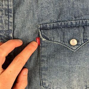 Levi's Blue Denim Pearl Snap Western Button Up Men's L Medium Blue Wash. **two minor spots near bottom front of shirt as shown in photos; no other flaws noted. Refer to all photos for condition and sizing.