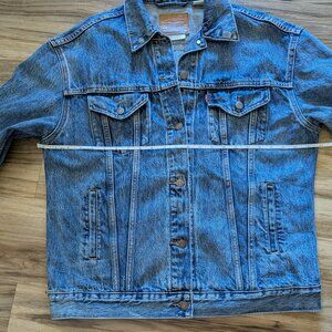 Levi's brand denim trucker jacket, size MEDIUM. Very slight distressing on collar, around bottom pockets, and on one sleeve (shown in photos). Great condition.