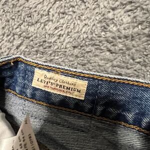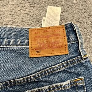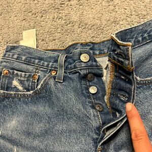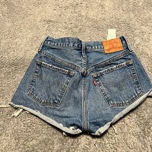 Stylish Levi's jean shorts. Distressed design. Classic blue denim.