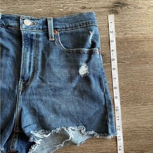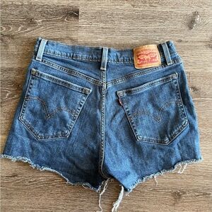 Trendy Levi's jean shorts with a distressed look. Classic blue denim. Perfect for casual wear.