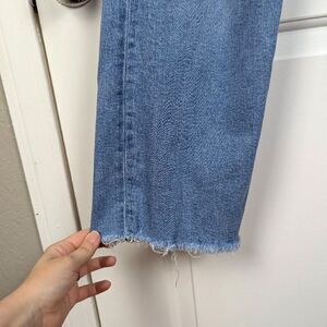 Ankle length cut with raw frayed hem finishing provides modern cropped styling.