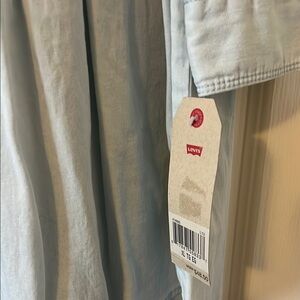 This Levi's dress features a casual yet sophisticated design with its buttoned front and mandarin collar. The long cuffed sleeves and crew neck add a touch of elegance, making it perfect for both work and casual outings. Its solid blue-gray color and lightweight fabric ensure comfort and style throughout the day.