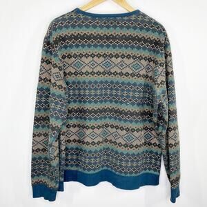 Blue, green, and yellow printed fleece lined sweatshirt. Long sleeves, crew neckline, long sleeves.