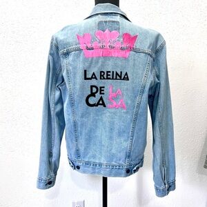 The phrase "La Reina de la Casa" translates to "The Queen of the House" in English, adding a unique touch to the jacket. Its bold and eye-catching design sets it apart from other garments, making it a standout piece in any wardrobe.
