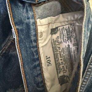 These Levi's blue jean shorts feature a medium-to-light wash with prominent distressed details and a frayed cut-off hem, offering a casual and authentic worn-in look.