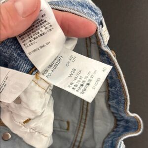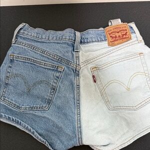 These Levi's blue jean shorts feature a stylish distressed design with frayed hems and a high-waisted cut. Perfect for a casual summer look, they offer a comfortable fit with raw edges for a trendy, lived-in appearance.