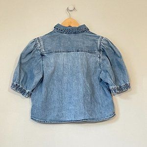 This Levi's crop top features a notched collar and 3/4 puff sleeves, offering a boxy and relaxed fit in a stylish blue hue. The button-down design adds a touch of classic charm, making it a versatile addition to any wardrobe.