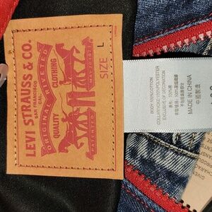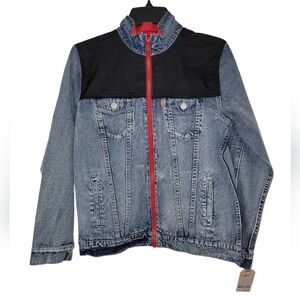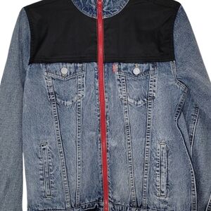 This Levi's jacket combines the classic appeal of light blue denim with a sporty black panel for a modern twist. The lightweight design makes it perfect for layering, while the bold red zipper adds a striking contrast. Ideal for casual outings, this jacket offers a relaxed fit and a stylish stand-up collar.