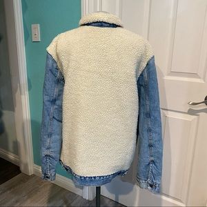 Stylish Levi's jacket with sherpa lining. Blue denim sleeves and trim. Cozy and warm.