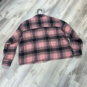 Stylish pink and black slightly oversized plaid button-up shirt. Perfect for casual wear.