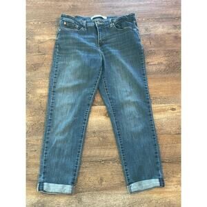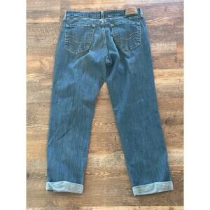 in excellent pre-owned condition. trendy cuffs, 5pckt styling, beltloops, button/zip closure
