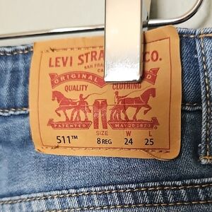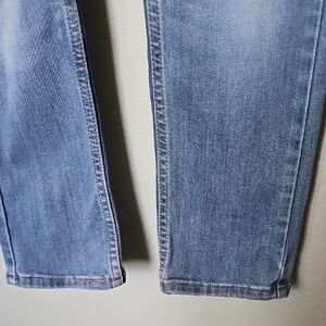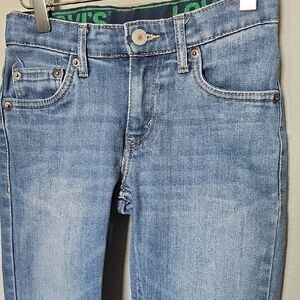 Levi's jeans in a classic blue shade. Perfect for casual outings. Great condition, barely worn before outgrown. Adjustable waist and stretchy fabric. Factory whiskering wash in back of legs for a cute distressed look.