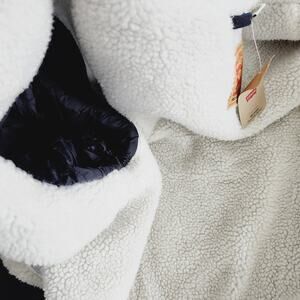 Color: dark brown and navy blue plaid with cream beige sherpa lining