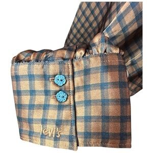 This Levi’s brown and blue plaid blouse offers a vintage-inspired design with modern elegance. Featuring delicate blue flower buttons on the cuffs and a relaxed fit, this top adds charm to any wardrobe. The lightweight, silky polyester fabric makes it perfect for layering or wearing on its own for a chic, casual look.