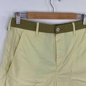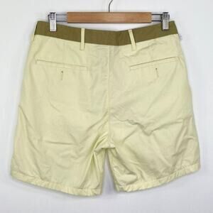Yellow tan 100% cotton chino shorts. Contrast waistband. Slant pockets, button closure, button closure. Back welt pocket with button closure.