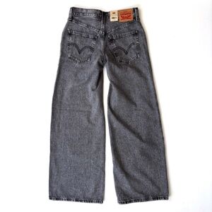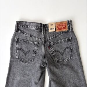 Chic charcoal jeans with a wide leg cut. Iconic Levi's style.